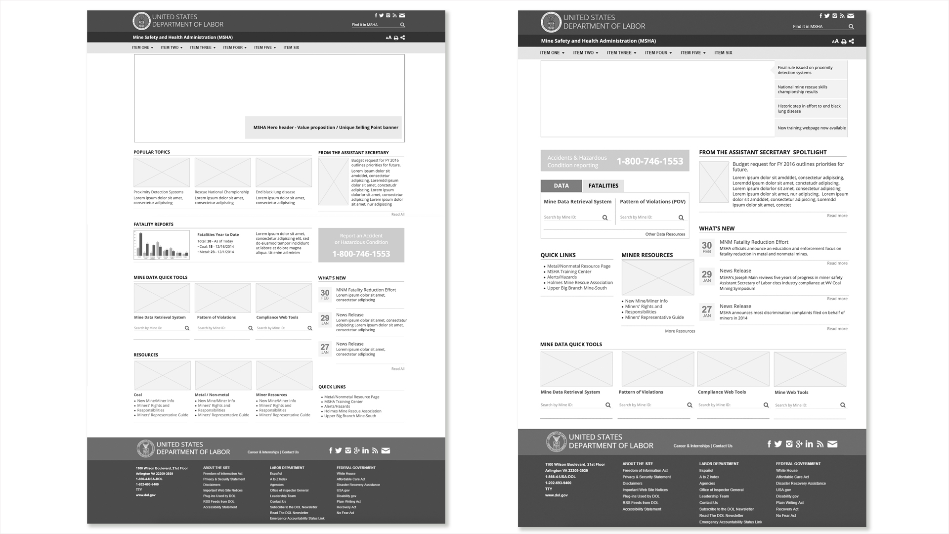 In this phase, I designed multiple wireframe options of a home page that conveys layout ideas, content, and page-level design that had useful features that featuring important components such as: Fatality reports, Mine Data Sources and calculations, Coal & Metal resources, Upcoming events.
