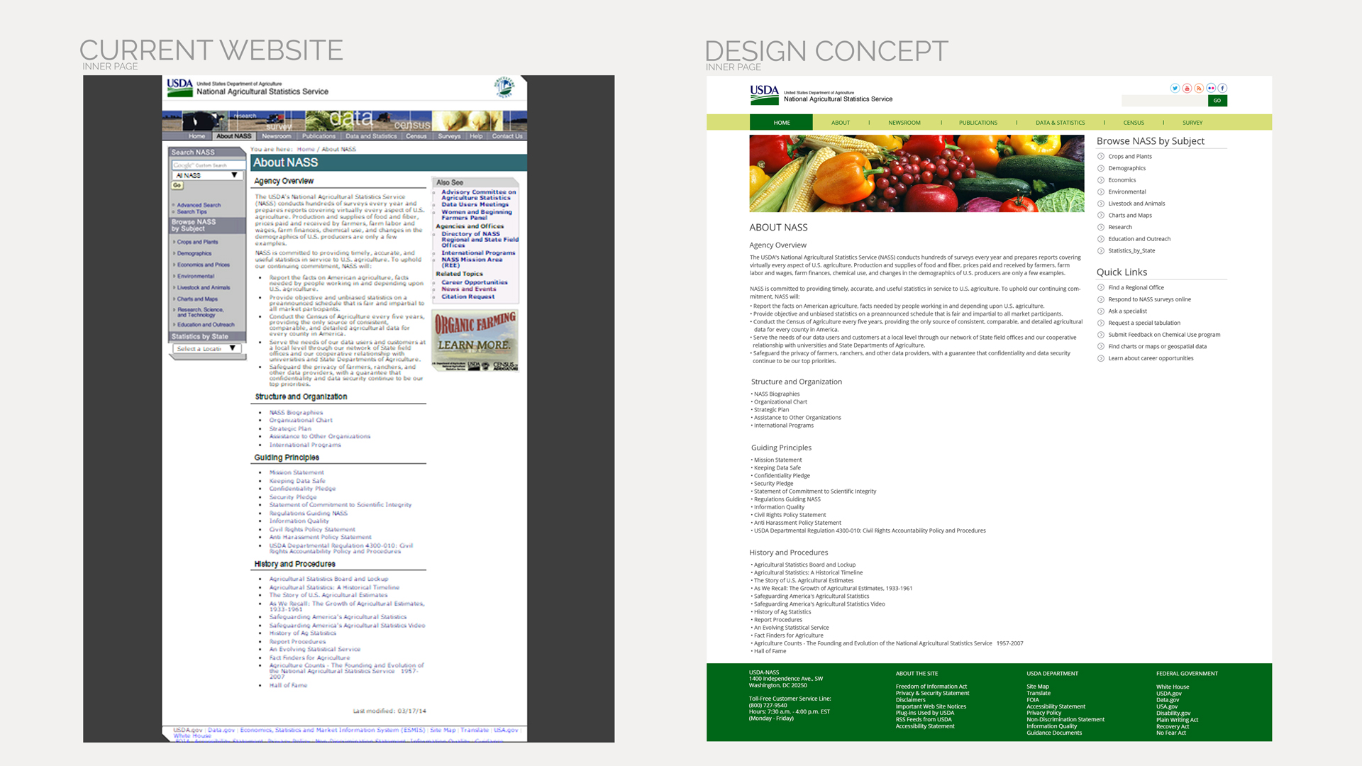 USDA’s National Agricultural Statistics Service (NASS) provides accurate and useful statistics in service to U.S. agriculture. They desired to improve their public facing online experience that meets the needs and exceeds the expectations of our internal and external customers. Our team were brought in to conduct usability testing of the existing NASS websites, create revised functional prototype based on our 1st usability testing finding and recommendations; and then conduct 2nd round of usability testing on the improved and user-centric website design concept/prototype we develop. In the end, complete final report on outcomes, recommendations and propose priorities.